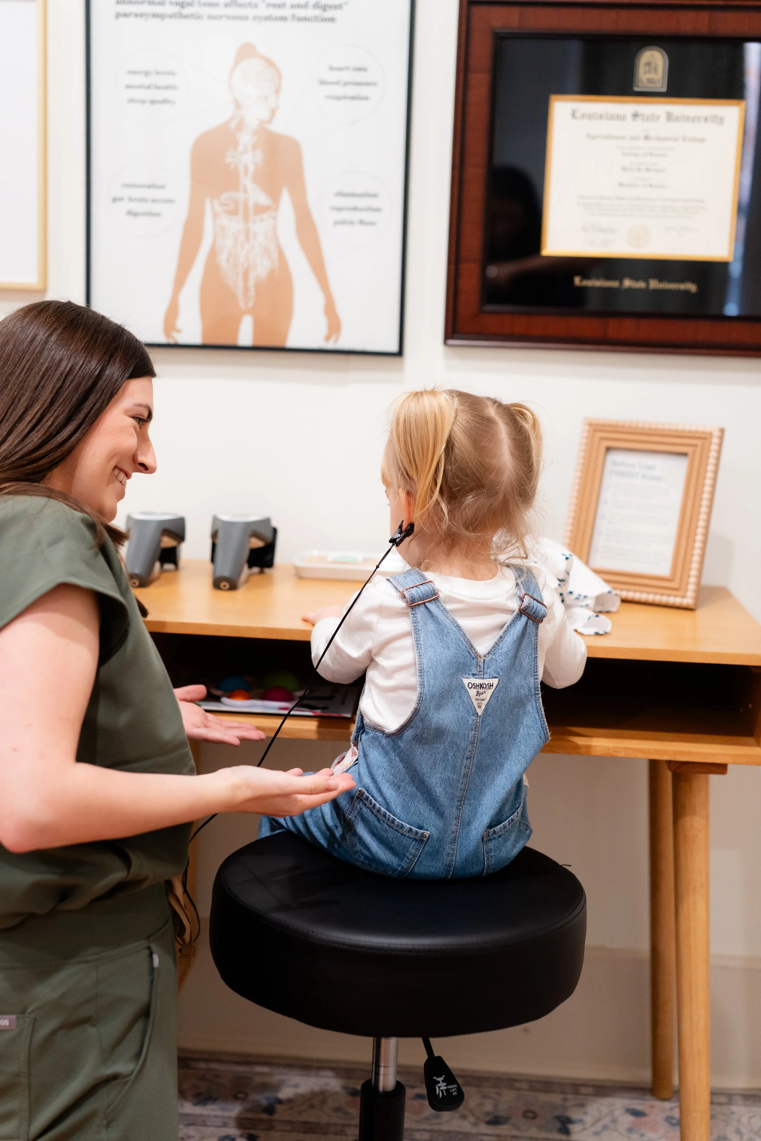 For your first visit, Dr. Kelli will sit down with you to discuss your health history, challenges, questions and goals for you or your family. Following the consultation, we will do an examination to evaluate and assess nervous system function, which includes a series of 3 non-invasive nervous system scans (scans will require access to the skin along the spine, so the patient will be gowned).